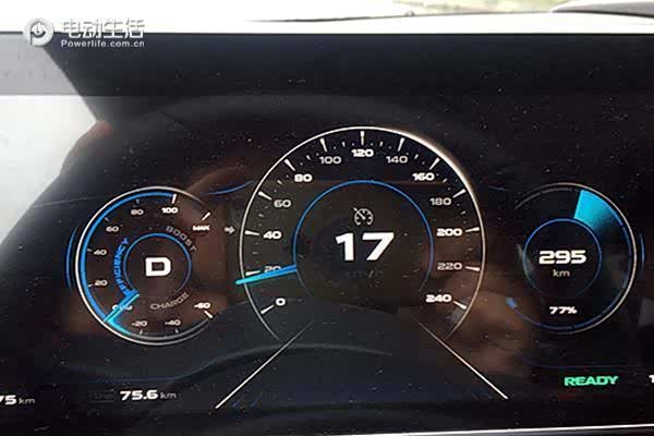 在城镇道路上显然车辆是最省的状态,低速时车辆很稳,伴随着满意回头率,动力数值也让我们很得意,平均车速基本在40以下,行驶了75.6km后,车辆还剩电量(295km)77%。按照总电量算,跑了这个公里数用电18.2度,减去音响、空调耗电量,这样的水平是完全nice的。