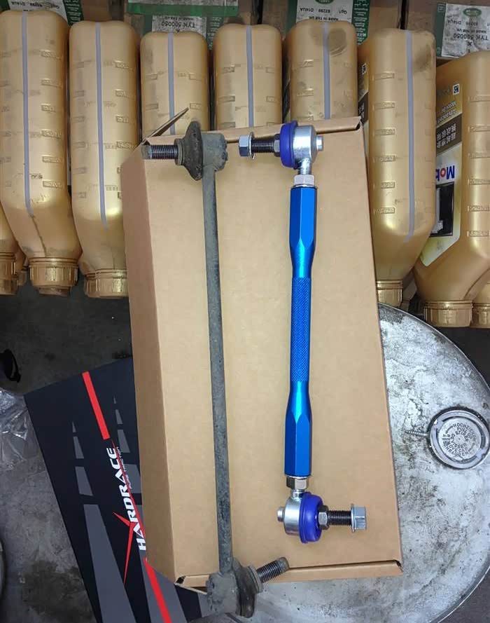 更换李子串(狗骨)是最为入门的修正车身底盘几何变形的办法。由于降低车身之后,防倾杆会随着摆臂上翘而向上摆动,这样会让防倾杆的活动行程缩短,而性能也会打折,为了避免这样的情况,在降低避震器高度的时候,最好更换可调长度的防倾杆连接臂。