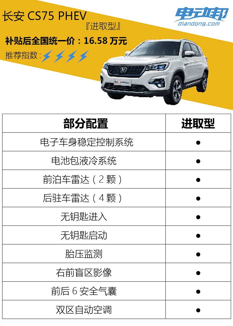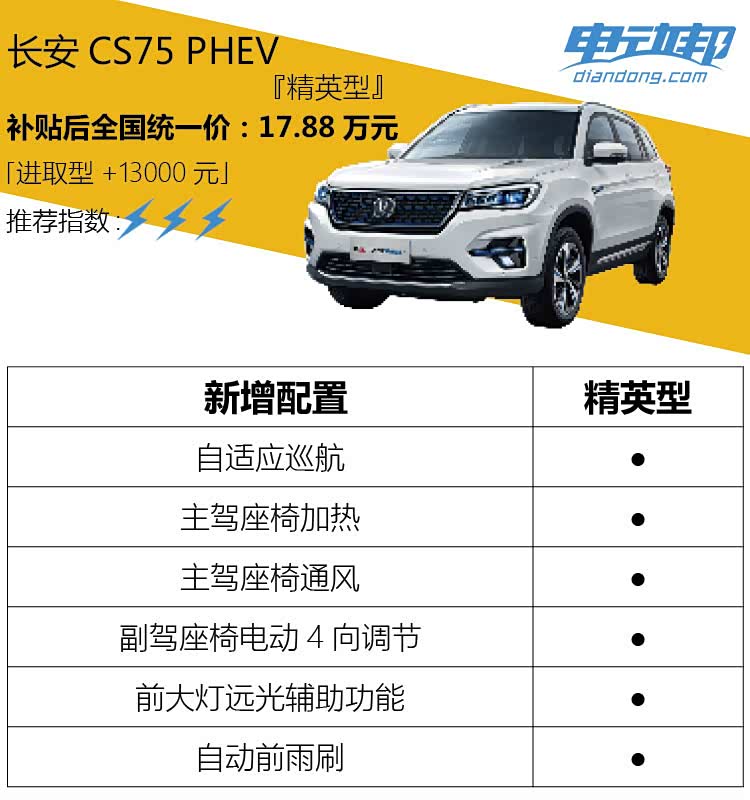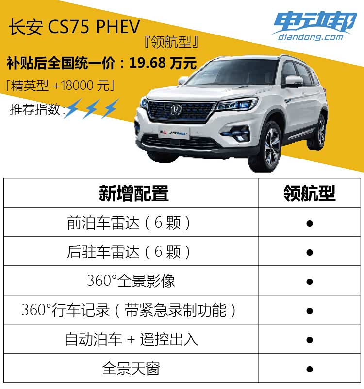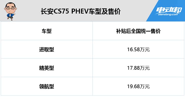 9月12日, 长安CS75 PHEV在上海正式上市,这款车定位为紧凑型SUV,共推出3款车型,补贴后全国统一售价16.58万元/17.88万元/19.68万元。