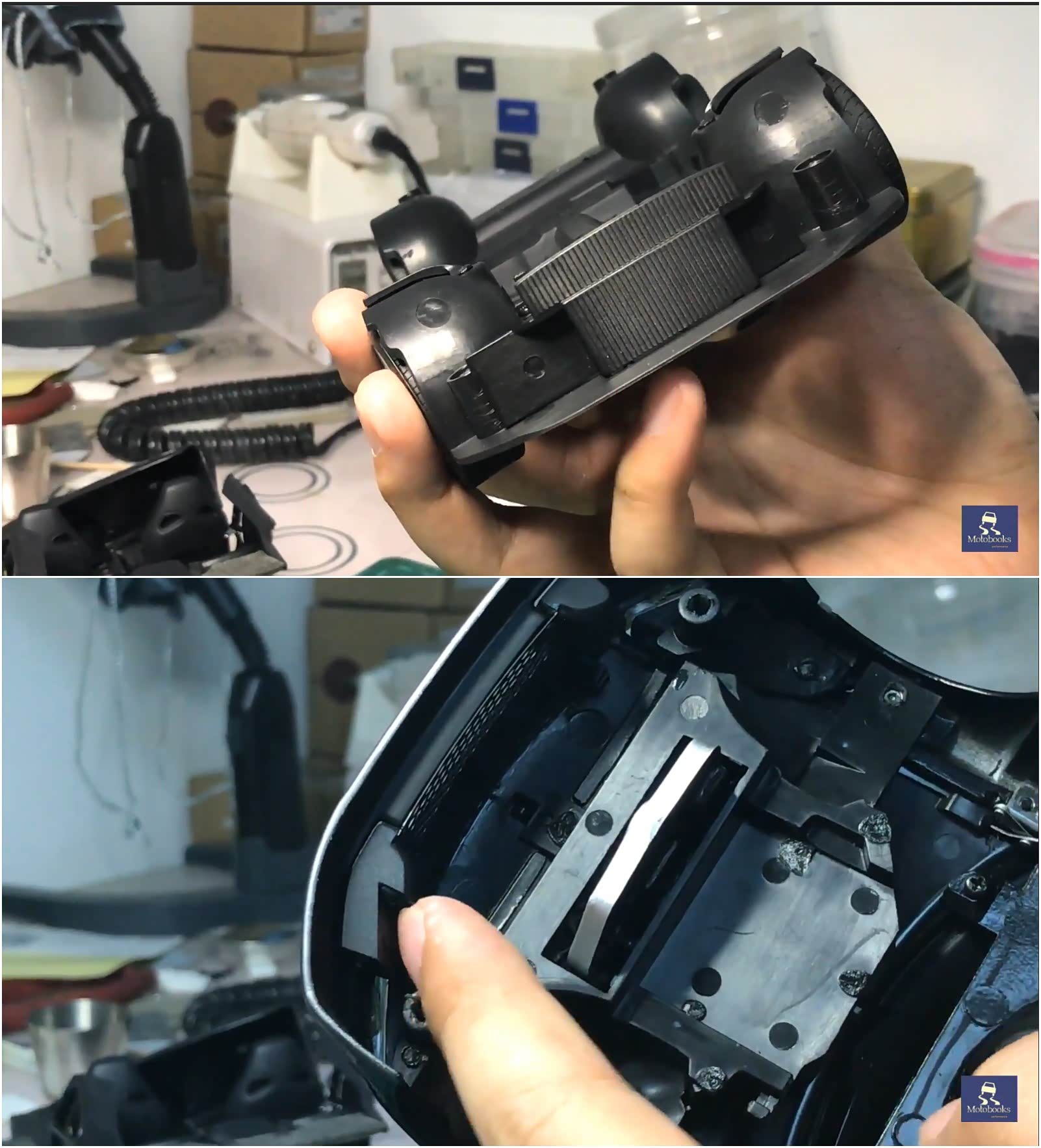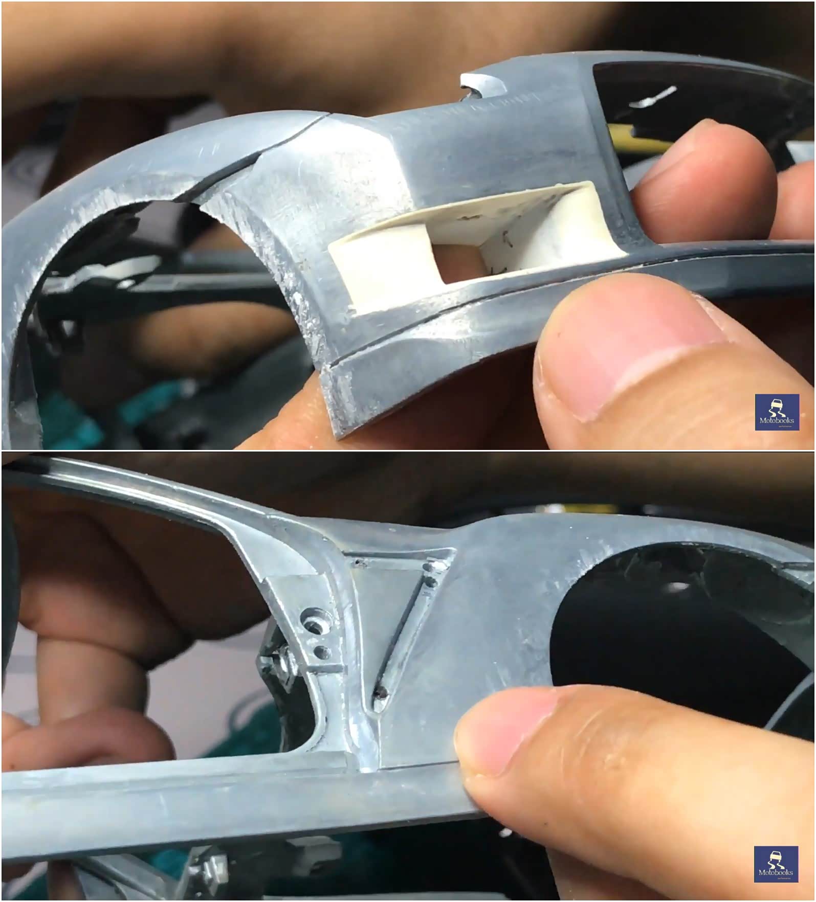 摘掉两块护板零件,才能看到隐藏在里面的底盘固定螺丝。由下图我们可以看到,护板是用热熔胶固定在底盘上的,动手的时候一定要注意力道,避免伤害护板零件。视频中也展示了比较准确的 “下刀” 位置,希望可以帮到有需要的同好。