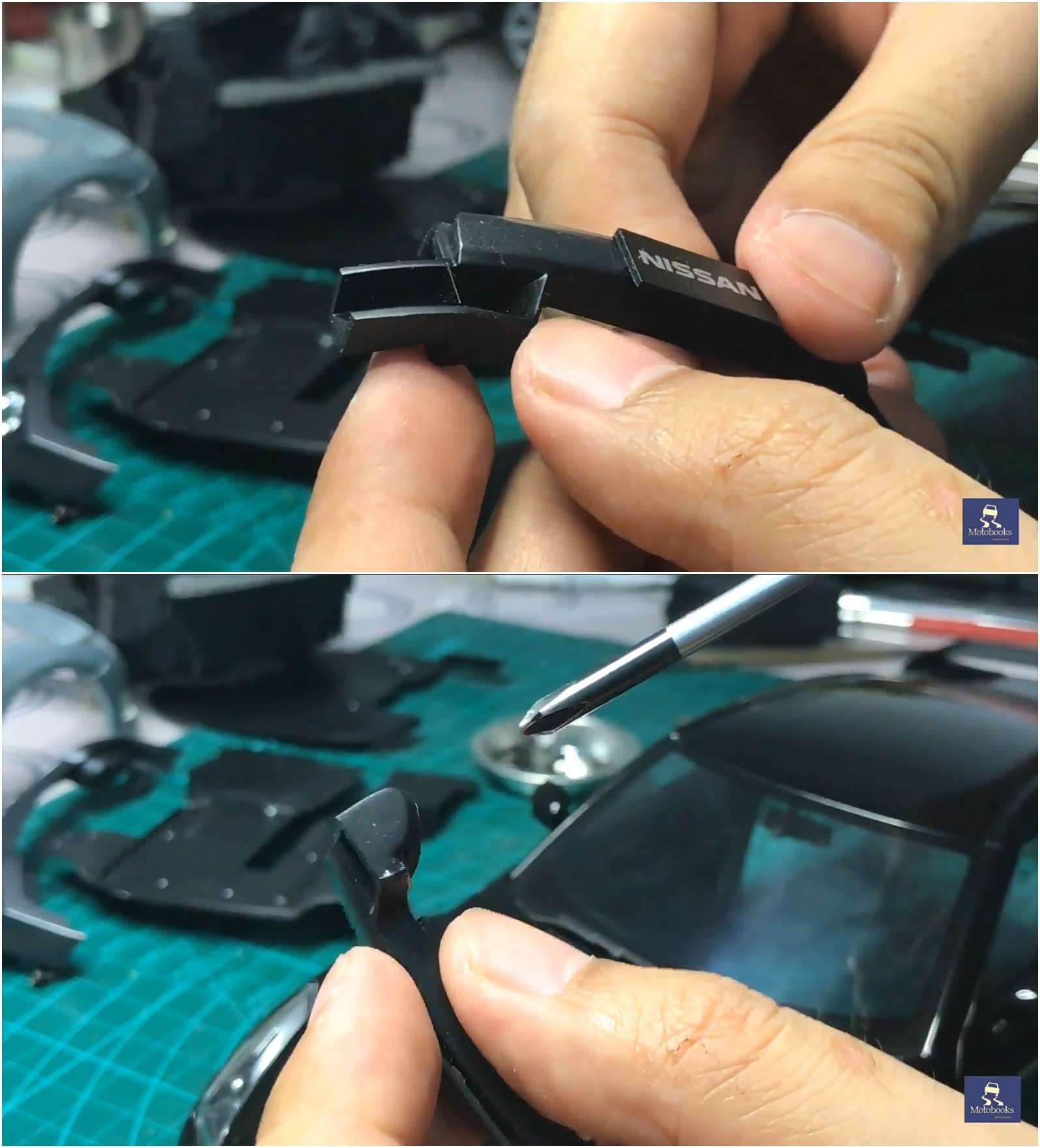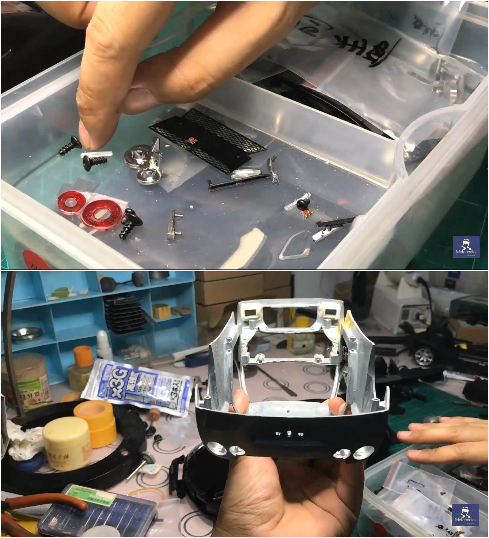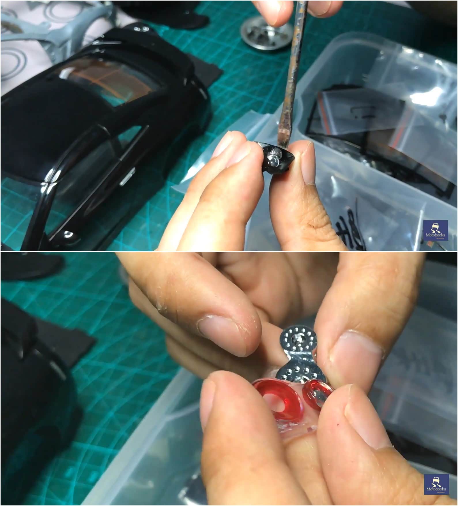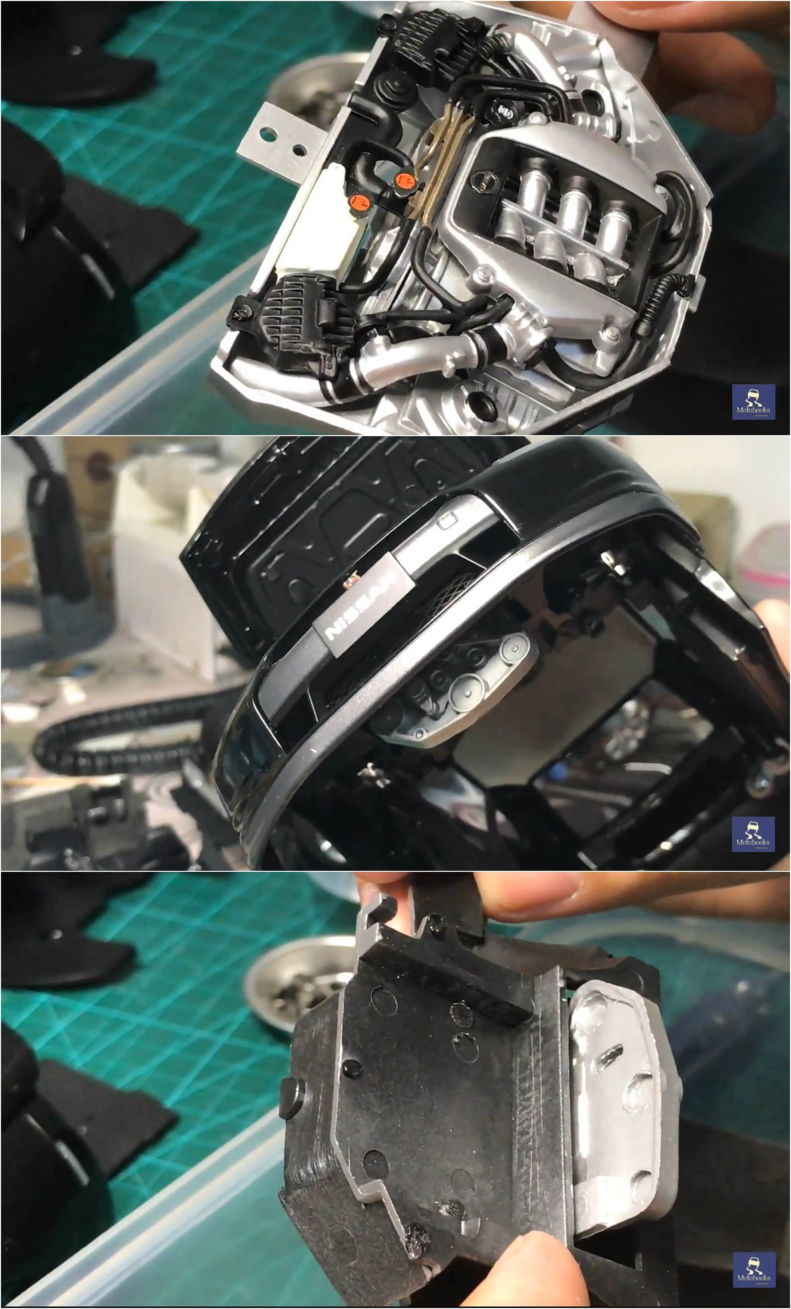 模型前后灯组方面没有什么工艺亮点,但我们搞清楚了 AA 是如何还原 R35 尾灯 LED 质感的:下图中可以看出尾灯组是由两片零件组成,一层是红色的透明件,另一层是镀铬塑料件。当它们结♂合的时候,就能还原出不错的视觉效果。具体请看视频中的相关内容。