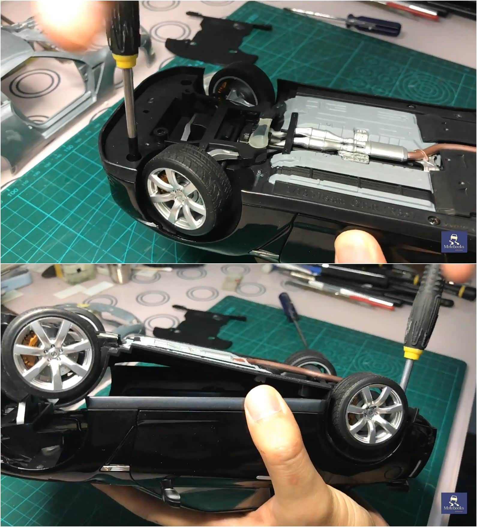 在这台 AA R35 模型的底盘上能看到一些固定螺丝,但这不是全部。想拆掉底盘零件就必须将前、后底盘护板零件撬下。这里需要一定的力道和经验,怎么拆下来?请看视频。