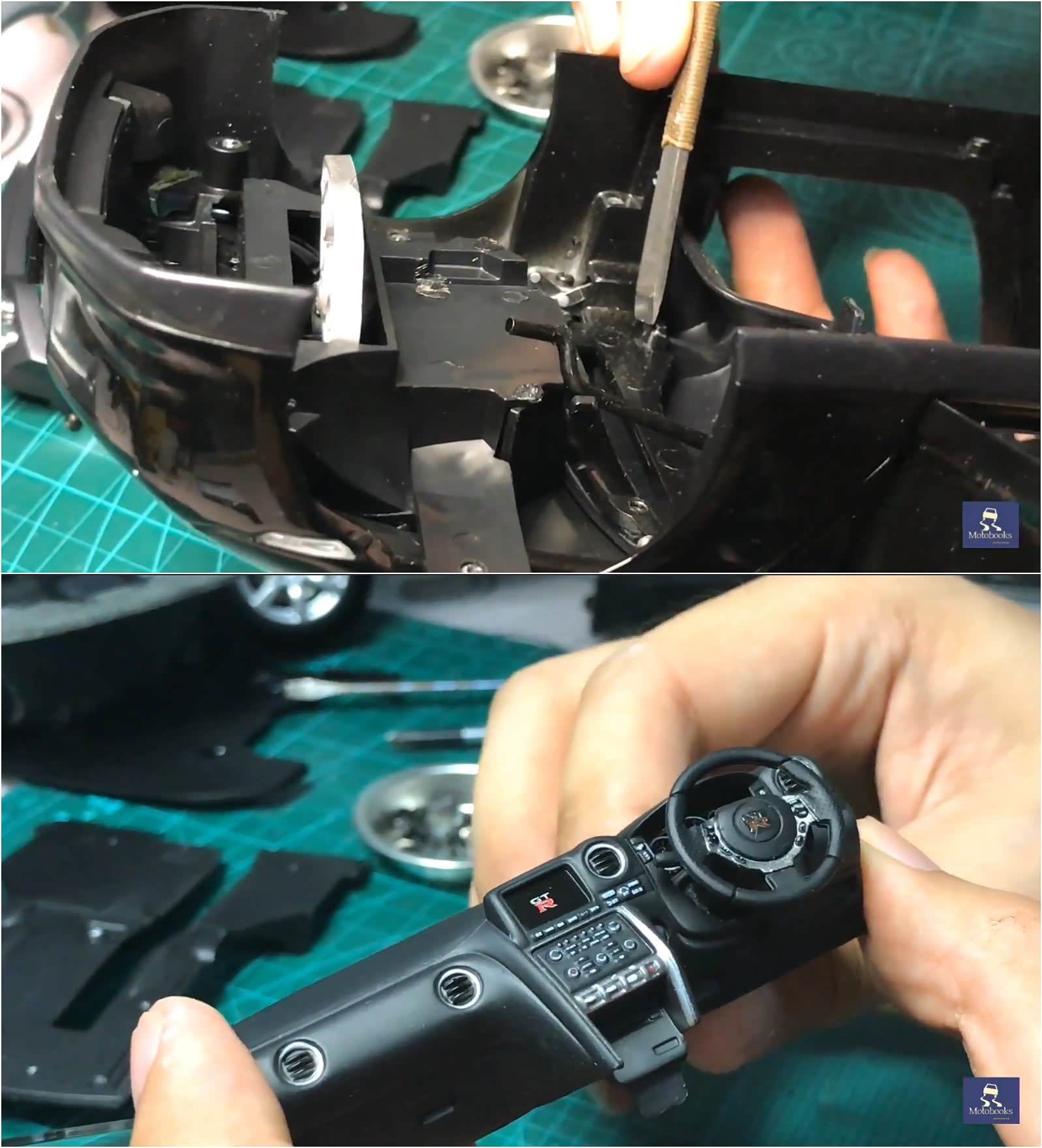 仪表板部分的细节刻画还是比较用心的,该有的标志性细节均有所表达,仪表的透明层次感值得称赞!哦,对了,你需要一把刻刀来拆掉模型内饰的中控台部分,具体的方法请见视频。