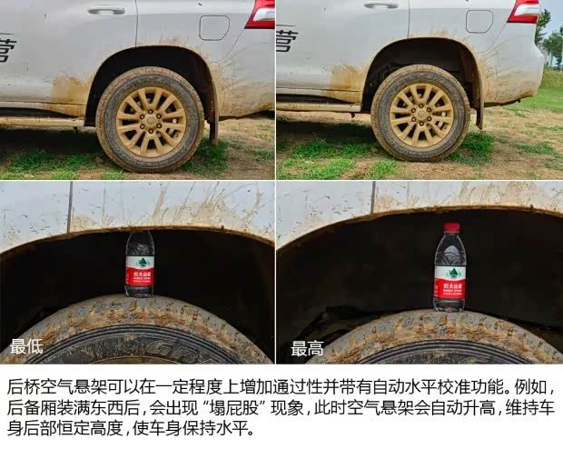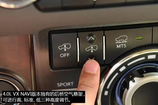 最后聊聊空气悬挂。普拉多顶配车型在后轴配备了空气悬挂,不仅能够调节车身高度,也能条件悬挂的软硬,满足公路行驶和越野驾驶中不可调和的对悬挂的要求。