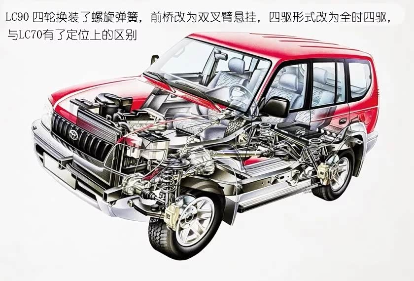 LC90放弃了LC70的钢板支撑,而采用螺旋弹簧,四驱由分时四驱改为全时四驱,前桥由整体桥改为双叉臂结构,对大梁参数进行了调整,缩短了车身尺寸,结构变化非常之大,与90年版所谓的“第一代普拉多”有了明显的界限。这也是我把96年款的普拉多划为第一代车型的原因之一。