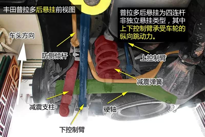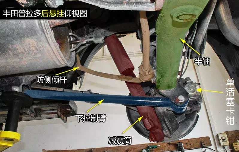 一直以来很好奇,为什么普拉多的后桥叫做“四连杆”,而结构相同的其它车型都叫五连杆。从上图中我们可以看到,普拉多共有下控制臂2根(或者叫下纵臂,下拉杆)和上控制臂2根,加上止推杆也是5根连杆,和所有5连杆车型是一样的,看完今天这篇帖子,别人再提到普拉多是4连杆结构时,朋友们就可以给他们好好科普一下了。从上图可以看出普拉多的上控制臂比较孱弱,与其它粗壮的悬挂部件比起来显得有些格格不入。