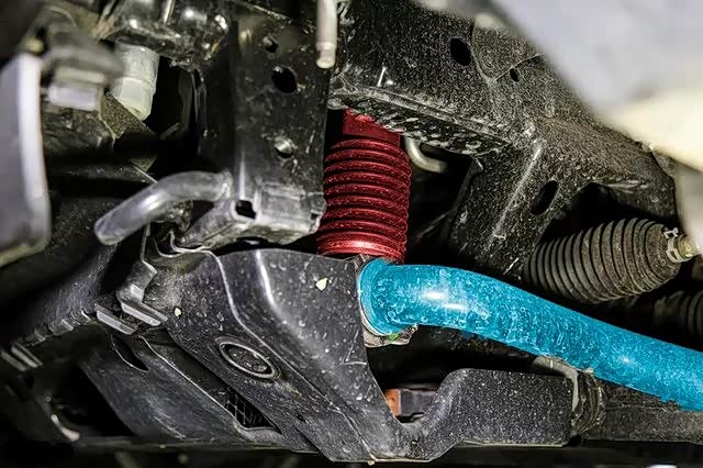 上图中红色风琴箱部件为前防倾杆上固定的KDSS系统的活塞,中高配车型配备。低配车型为常规拉杆。