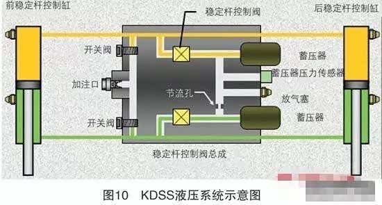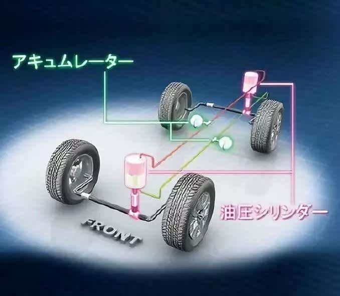 上联:公路行驶车辆发生侧顷时,由于同侧的悬挂同时受到大体相同程度的拉伸或挤压,液压油缸中的液体保持平衡,通过精妙的机械设计,阻止前后稳定器中的液体循环流动,此时前后稳定器发挥相当于防倾杆的作用,从而阻止车辆进一步侧顷。