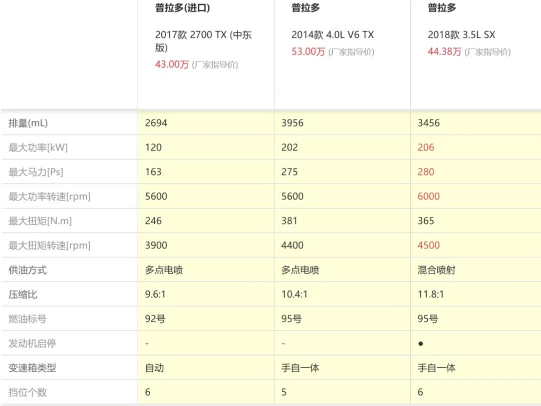 目前在售的普拉多动力共有3种(不算柴油),分别为2.7L,3.5L和4.0L自然吸气发动机。