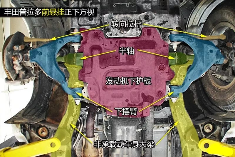 普拉多采用非承载式车身,前轴为双叉臂独立悬挂,后轴为4连杆整体桥+弹簧减震悬挂。