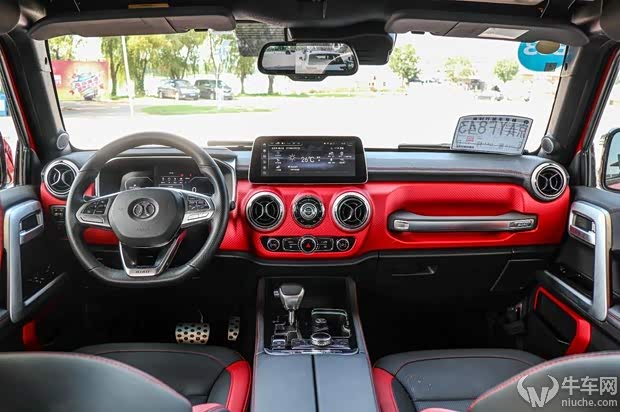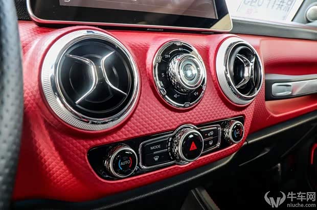 图:和奔驰出风口相似的设计已经不新鲜了,也突出了北汽品牌LOGO。把一键启动和驱动模式切换的旋钮设计在一起,并且放在了出风口中央,这还是挺新鲜的,要比很多硬派越野车使用物理档杆切换驱动模式的做法,显得更加城市化。实际体验中,有两驱切换至高速四驱,只要在车速20km/h就可以操作了,而低速四驱的切换必须要在静止且在空挡状态下才可切换,等仪表盘显示4L,就算完成了,大概在3秒左右。