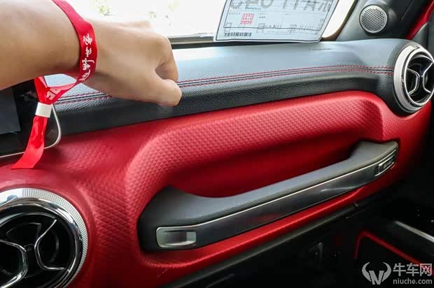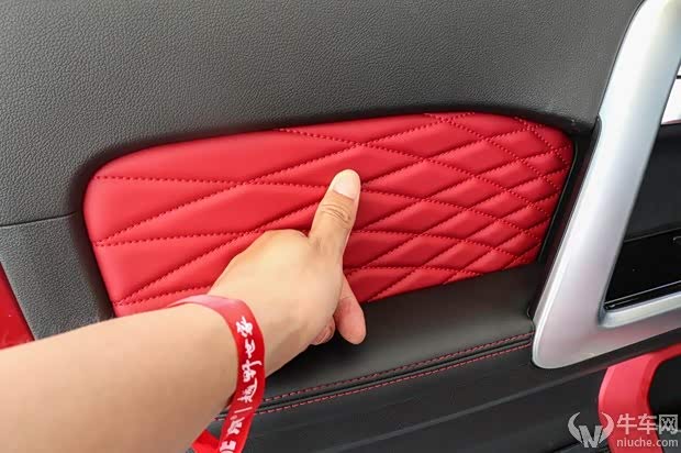 图:红黑拼接的内饰风格也延伸到了左右两侧的门板上,而且门板还用很软的皮质材料包裹,做工没得挑。