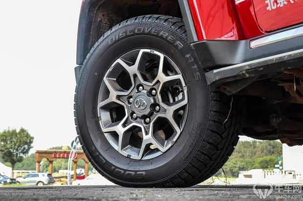 图:实拍的BJ40 PLUS配备了尺寸为265/65 R17的固铂纵横者轮胎,比BJ40L的胎宽增加了20mm。六孔式轮圈采用银、灰配色,也增加了精致感。