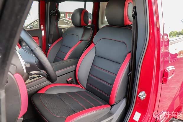图:前排座椅同样采用黑红拼接包裹,座椅的柔软度相当不错,坐起来有明显陷入感,两侧护翼带来的包裹性很充足,感觉不像是一台硬派越野车,更像是城市SUV。