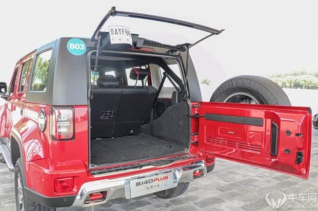 图:BJ40 PLUS的后备箱开启方式有一定可玩性,日常放取行李比较可通过后窗以及尾门,后备箱容积也不错,户外穿越能带很多行李装备。只是尾门打开后没有限位,也就是说自己就会往里合,这有些说不过了,总得用手扶着,很怪。