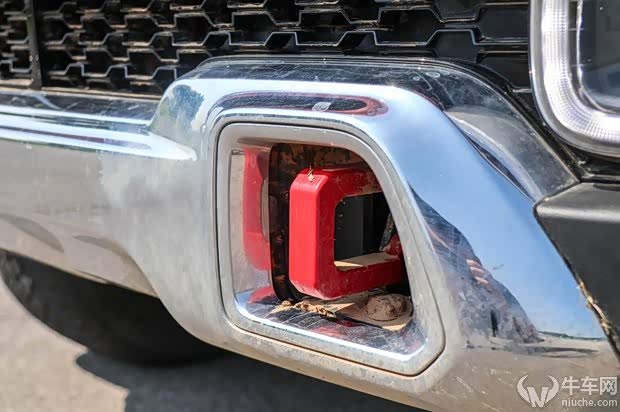 图:拖车钩分布在车头镀铬包裹的前杠两侧,并且用红色漆料进行涂装。