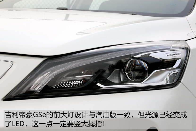 吉利帝豪GSe的大灯设计与汽油版GS完全相同,包括内部灯杯的造型也完全一致。但不要伤心,电动版GSe大灯已经升级成LED光源了,这一点还是非常厚道的!其实这么设计也是可以理解的,毕竟在能耗上LED要比氙灯更加节省电量,而且LED的稳定性更强,点亮速度也更快。所以目前主流电动车基本上都使用的是LED大灯。