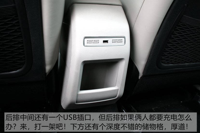 再往后的中央扶手箱内有两个USB接口,如果能把这两个USB接口放在中控台附近就更好了,因为我自己车的中央扶手内就堆满了杂物,USB完全被淹没了。