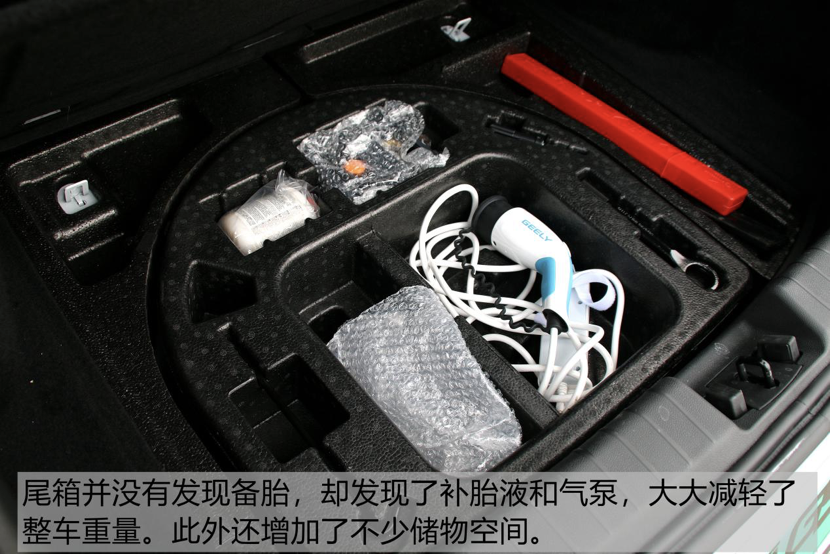 尾箱内并没有备胎,这样的好处也是很直接的减轻了整车重量,增加了一定的续航里程。扎胎了?别怕!这里有补胎液和气泵,绝对能让你开到修理厂了。
