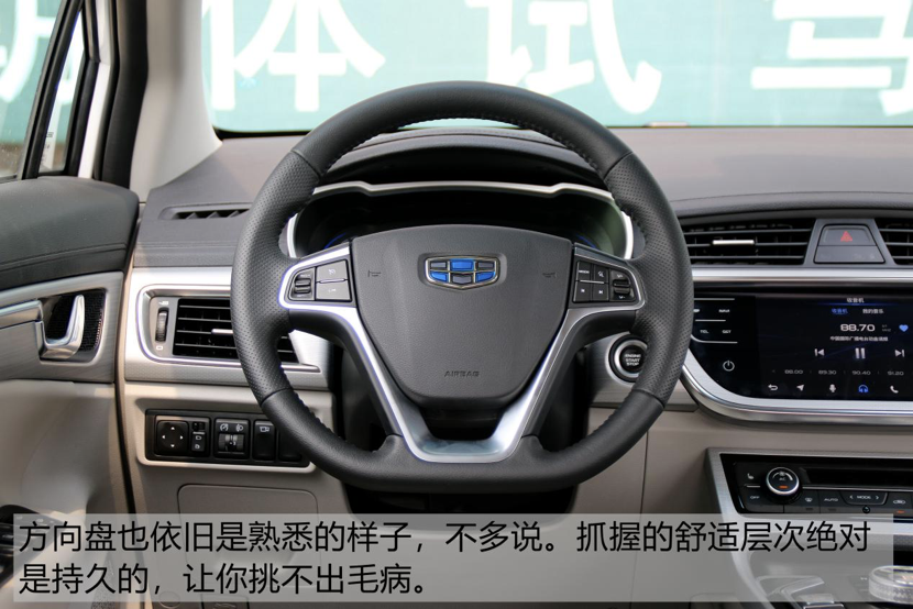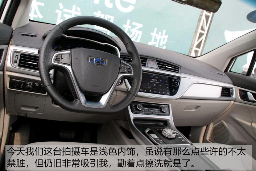 在目前都在争先把液晶屏做到天花乱坠的年代,吉利依旧坚持走自己低调的家用路线,其实这并没有什么不好!之前试驾过的很多车型,由于仪表盘显示内容过于繁杂,都会让我找半天我想找的数据,其实这样并不是好的用户体验。简单明了、干干净净的仪表盘是我喜欢的风格。