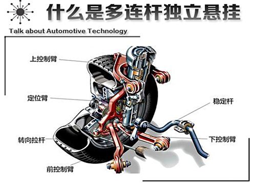 那么独立悬挂就一定独立吗?如果按要求严格的区分,有些多连杆并不是纯粹的独立悬挂。因为独立悬挂的前提是两个轮子独立运作,互不干涉,但是在一些车型上,为了防止独立悬挂下轮子的横向偏移,在两轮之间加上了一条横向稳定杆,有了这样一条连接,那就自然不能算是独立悬挂了。
