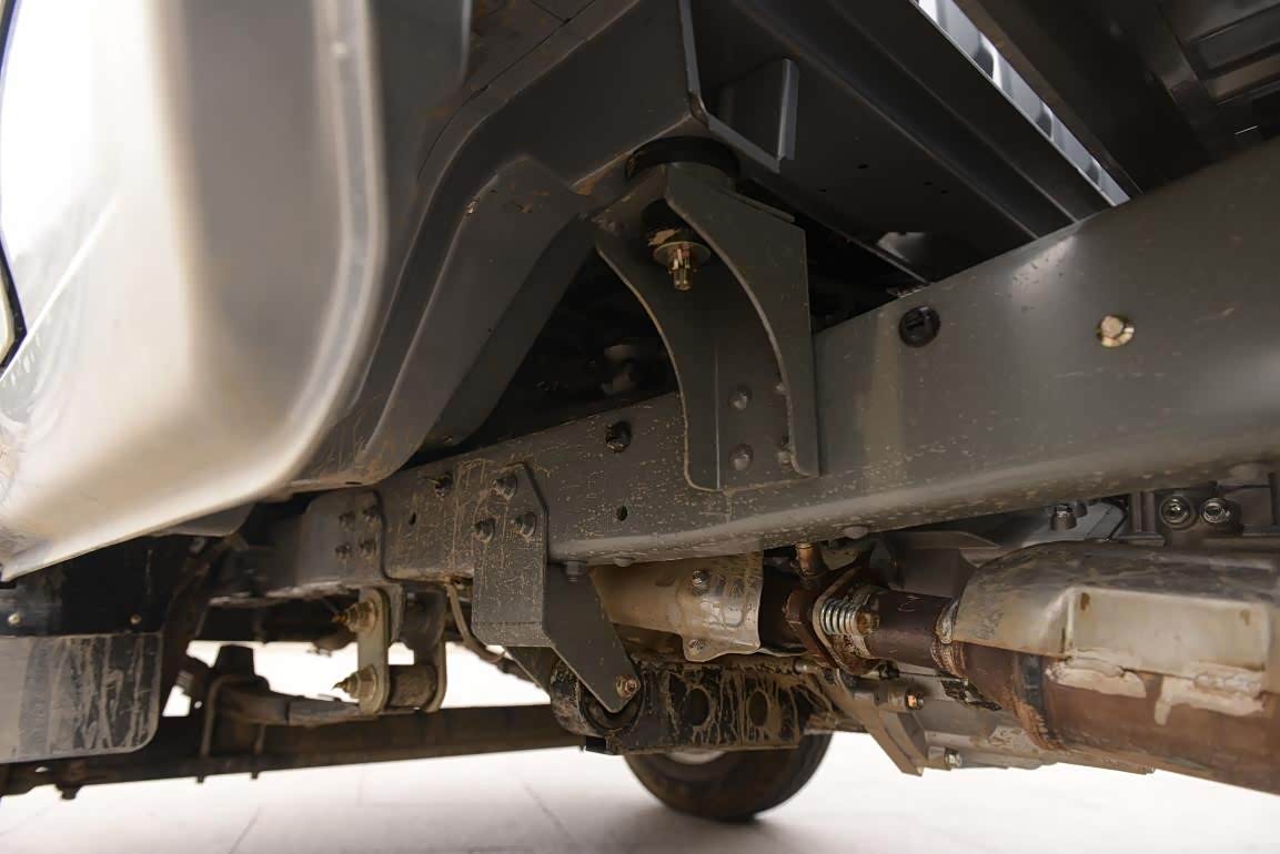 该车采用的是运载能力更强的非承载车身,也就是我们熟知的大梁结构。整个车架为前窄后宽结构,前部窄车架是为了方便安装发动机与变速箱,后部宽车架则保证了车辆的运载能力和行驶时的稳定性。要知道当代卡车讲究的就是车架的宽度,宽车架代表着车辆的高承载能力和稳定性。