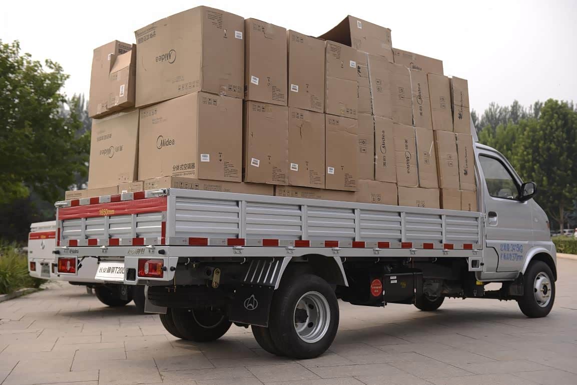 车厢尺寸为3600×1650×370mm,从上图中我们不难看出,神骐T20L的原装车厢底部可以完美容纳十几个尺寸为840×390×630mm的家用电器纸箱。所以说这辆车比较适合运输家用电器,或者是一些纸箱类货物。另外,长安神骐T20L因其大梁表面呈现出平面,除了兼容平板车型以外,还可以根据用户的需求改装成厢式货车、仓栅车、冷藏车等车型。