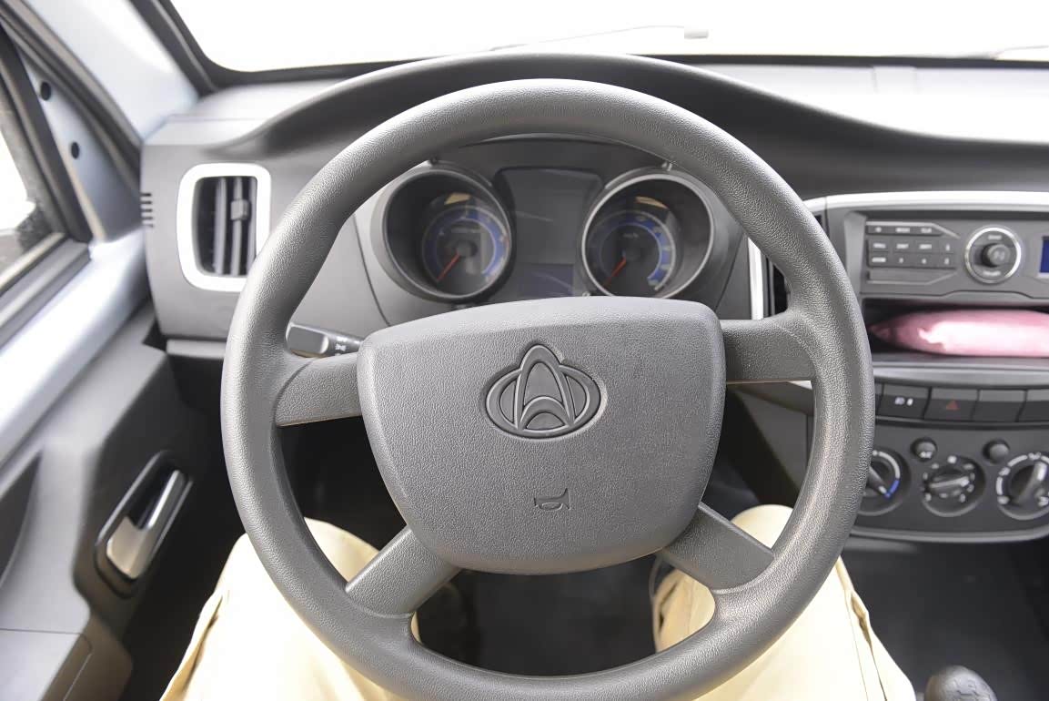 方向盘颜色为全黑,非常简洁。仪表盘造型为炮筒设计,左边是发动机转速表,右边则是车速表。有很多微卡车型只有车速表没有转速表,驾驶员只能凭借经验更换挡位,这样就会造成油耗偏高,而安装了转速表对于刚上手的驾驶员来说还是有帮助的。仪表盘中间还安装了比较简洁的LED液晶显示器,看上去非常直观。