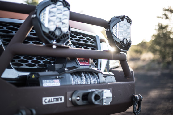 车头选择了大倾角的攀爬杠,杠的上半部分微微隆起,可以在越野时对抗突然遇到的“台阶”和岩石等路况,保护发动机,并带有Warn 12,000磅的绞盘,整体风格比较注重实用。