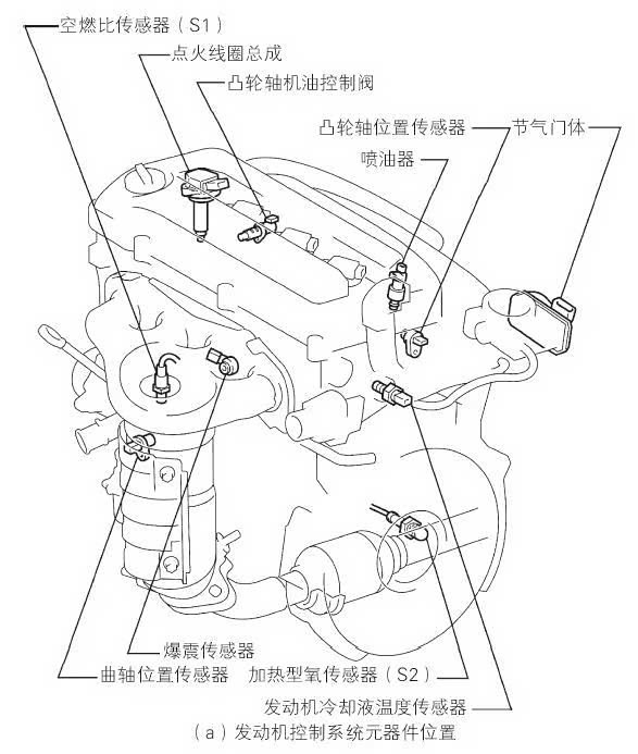 汽车元器件布置图与汽车线束图类似,标注了电控系统传感器、执行器在汽车上的安装位置,布置图和线束图、电路图配合使用可以在实际维修中快速定位传感器、执行器、继电器、熔丝等的详细位置,再配合插脚图能更加准确快捷地定位故障元件。下图为发动机控制系统元器件位置以及熔丝、继电器安装位置。