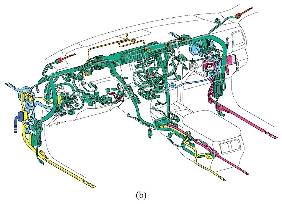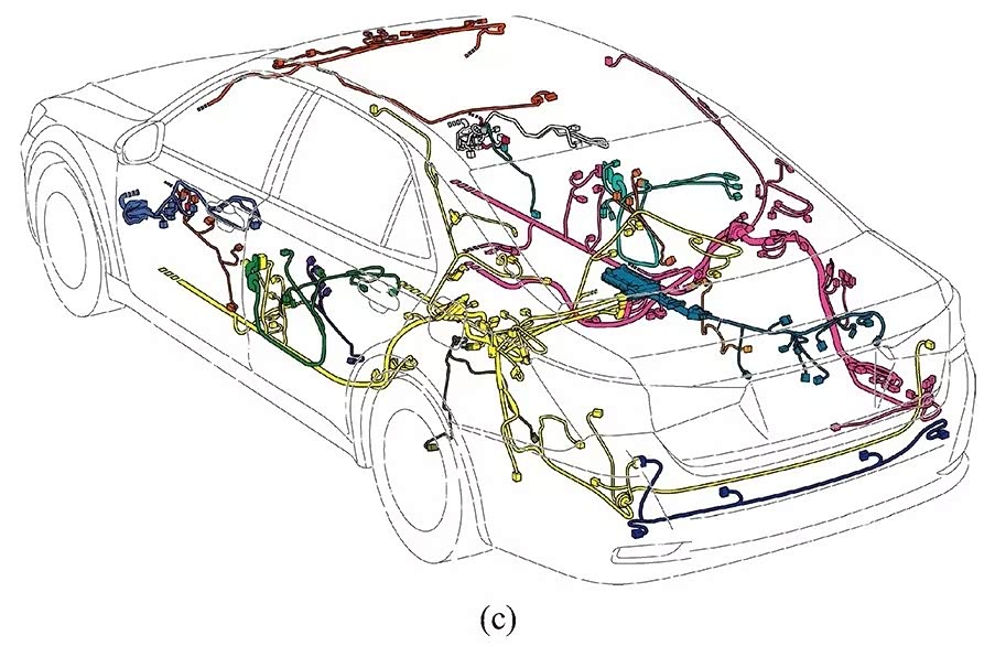 汽车线束是电路的主干,通过插接器、交接点与车内电器或车体连接,可从线束图中了解线束的走向及线束各部插接器的位置。一般线束图是按照系统或在车辆上的安装位置分类,如2016 款丰田皇冠线束图分为发动机室、仪表线束、车身、座椅和天线及部分,如下图所示。