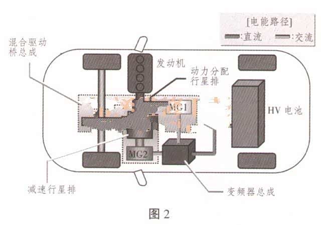 丰田卡罗拉混合动力系统( Hybrid Synergy Drive)由发动机、混合驱动桥(发电机、电动机、双行星排)、变频器和动力电池组(HV电池)组成,如图2所示。