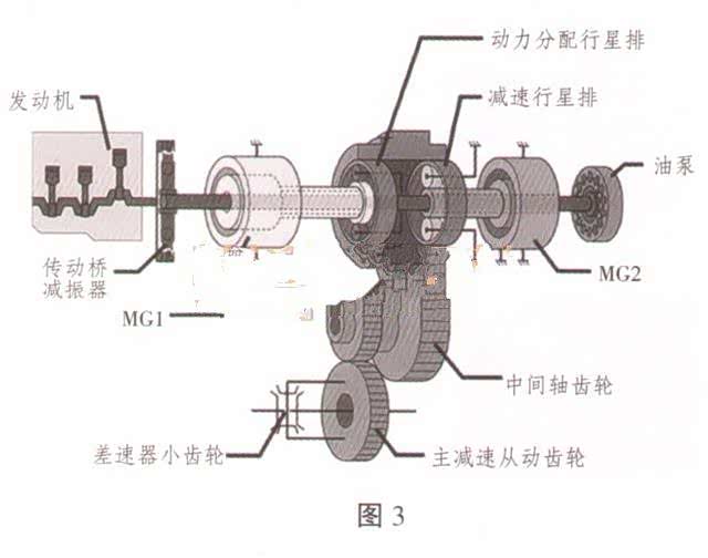 2.混合驱动桥。混合驱动桥总成主要由电机MG1、电机MG2、动力分配行星排、减速行星排等组成。双排行星齿轮机构将2个电机与发动机有机联接,可以实现电机与发动机的动力分配和无级变速。