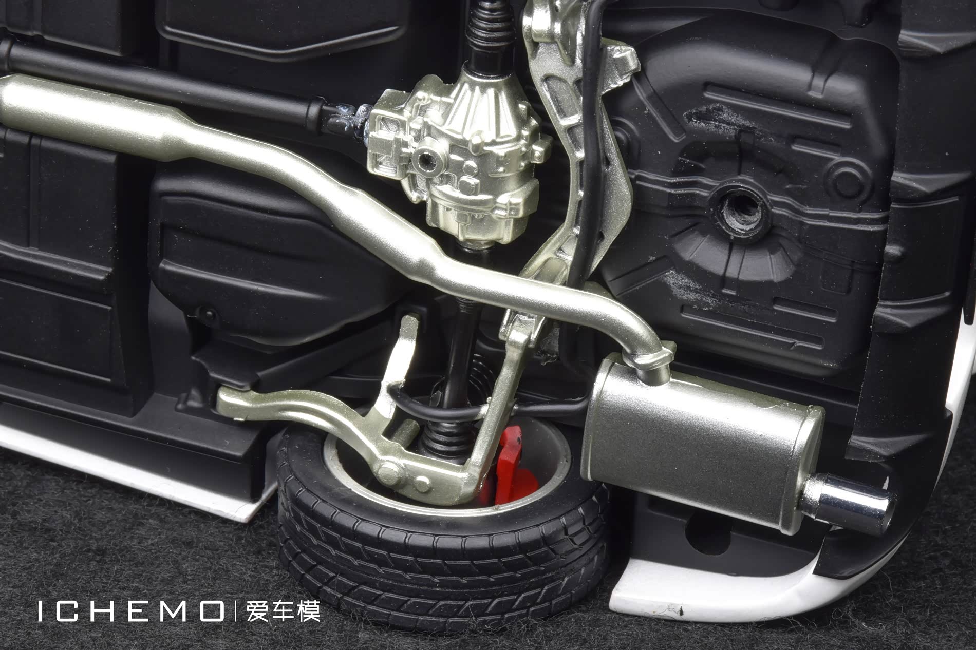 模型后备箱零件与车体采用 “狗腿” 方式连接;后备箱负面有龙骨细节刻画;内饰有植绒工艺。值得一提的是,位于后排座椅后备箱面处有红色的平衡拉杆细节。