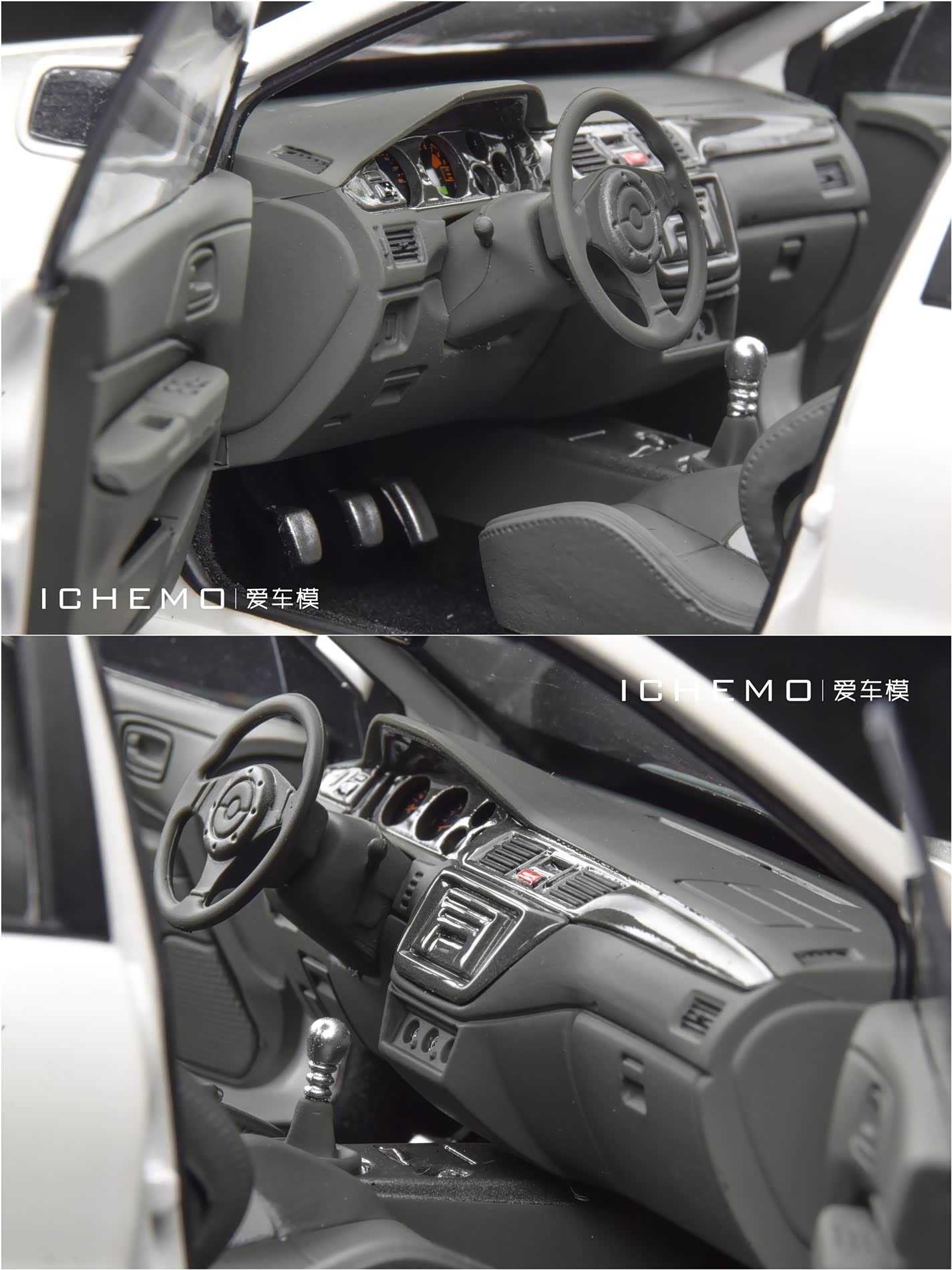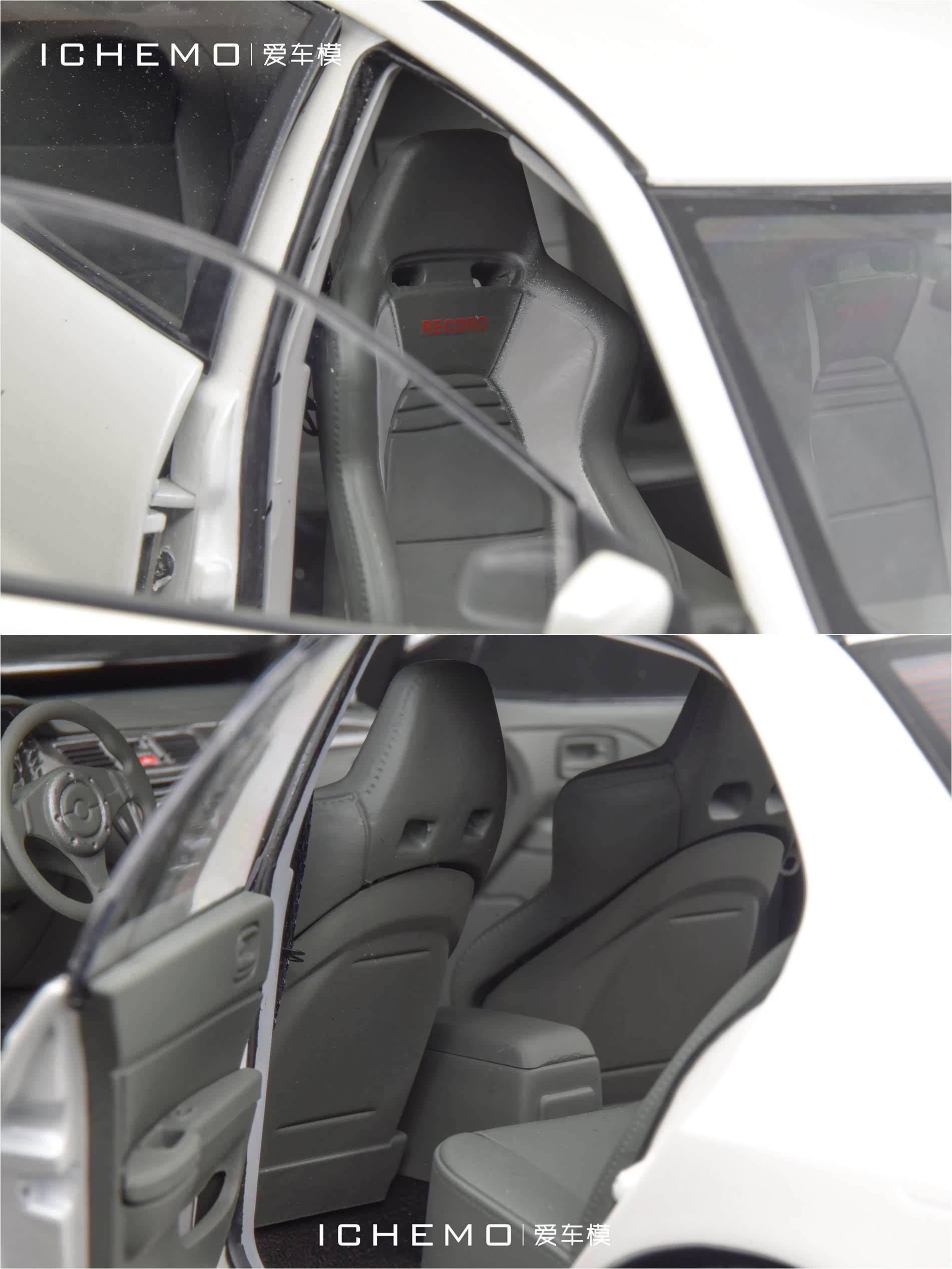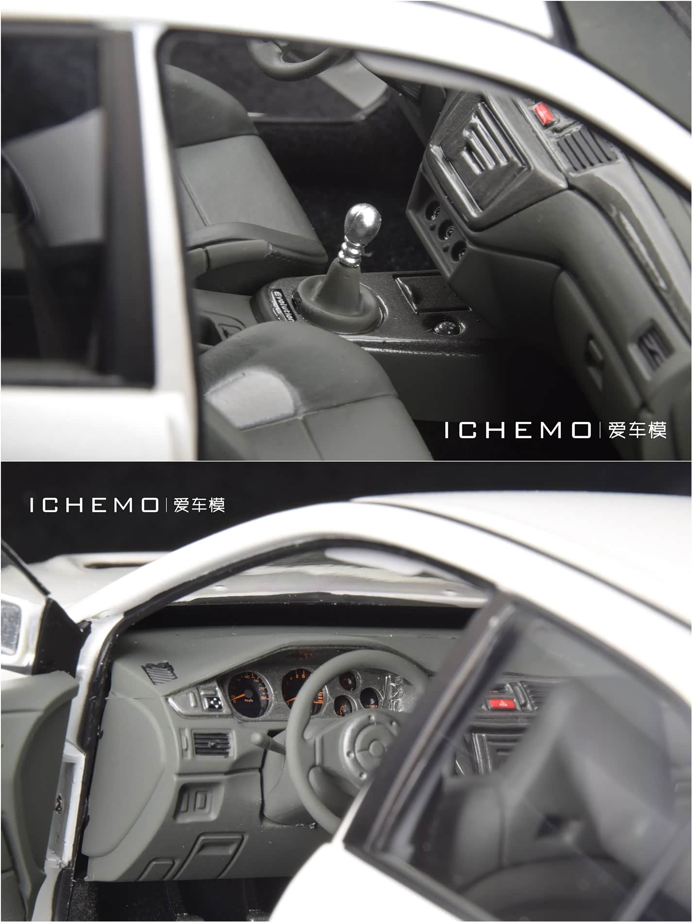 位于档把下方的 “Evolution” Logo 和 Recoro 座椅 Logo 细节得到了还原;各仪表字符清晰可辨;灰/白色座椅分色采用喷漆工艺,但在该样品模型车上出现了溢色现象;安全带零件为黑色织物材质,搭配分色金属材质蚀刻片安全带插扣。内饰地板有植绒。
