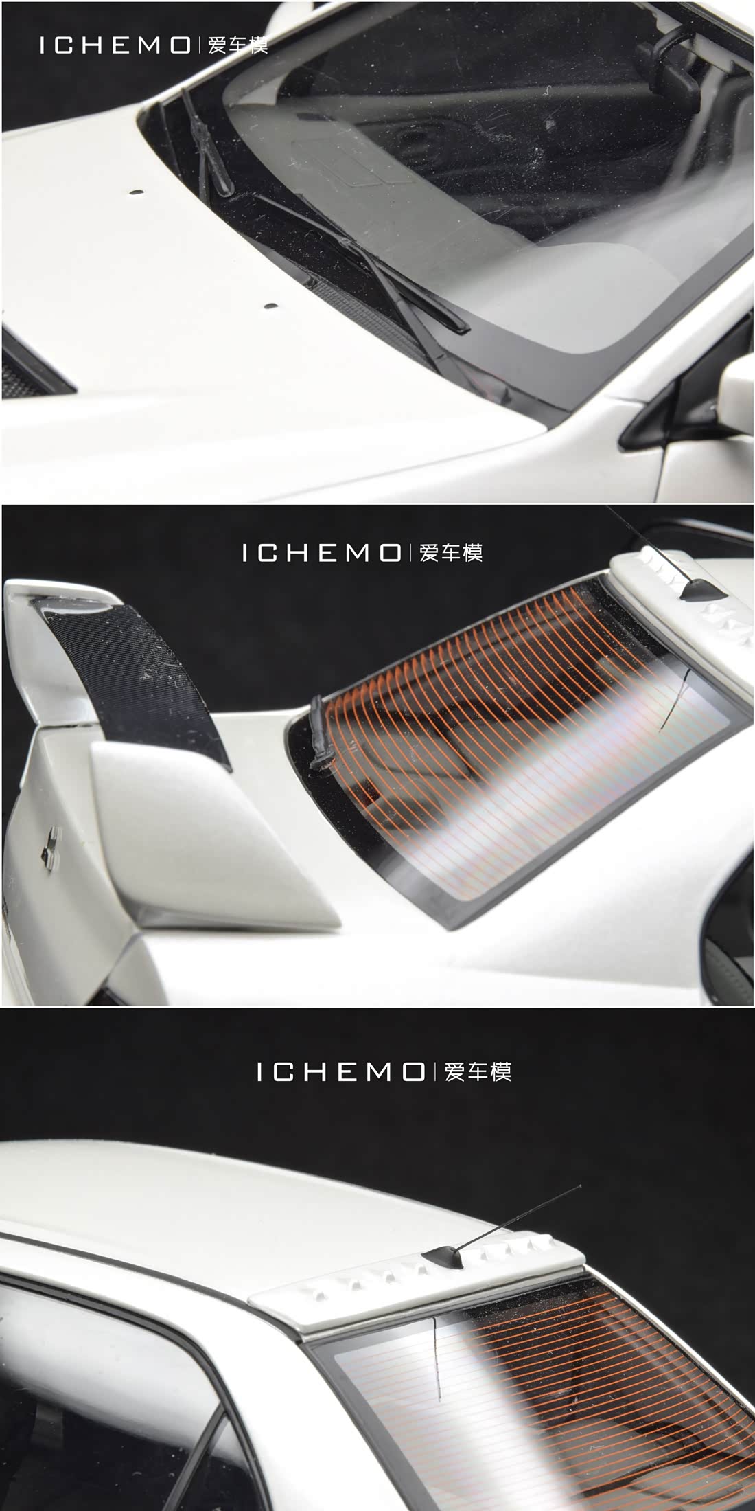 前/后雨刷器为独立的塑料材质零件;后窗还原了电加热丝细节;车顶天线为金属材质,但十分脆弱;塑料材质尾翼中部使用了碳纤维水贴。另外特别值得一提的是,车舱内部边框、后备箱内部边框、挡风玻璃边框等处均有黑色分色密封条/导水槽细节表达。