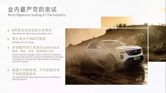 除了搭载一系列创新技术,在凯迪拉克XT4上市之前,这款全新2.0T可变缸涡轮增压发动机在中国进行了共计9种、累计465万公里的系统耐久性测试,包括为Tripower系统新增的主动燃料管理耐久性测试,经历4500米高原、极寒、高热、高湿、高腐蚀等不同工况,对车辆性能进行全面严格验证。