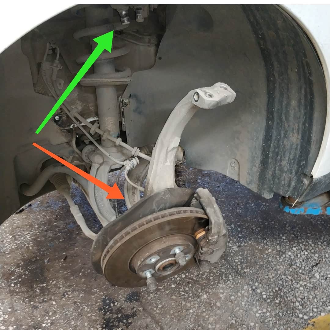 下图所示,这是奥迪Q5左前部的情况。为了拆下左前半轴,师傅把固定半轴的大螺丝给拆了下来,同时也把绿色箭头所示的两个小上支臂给拆了下来!