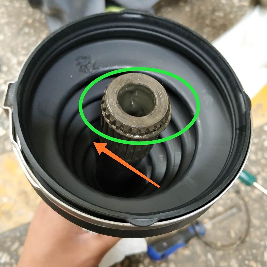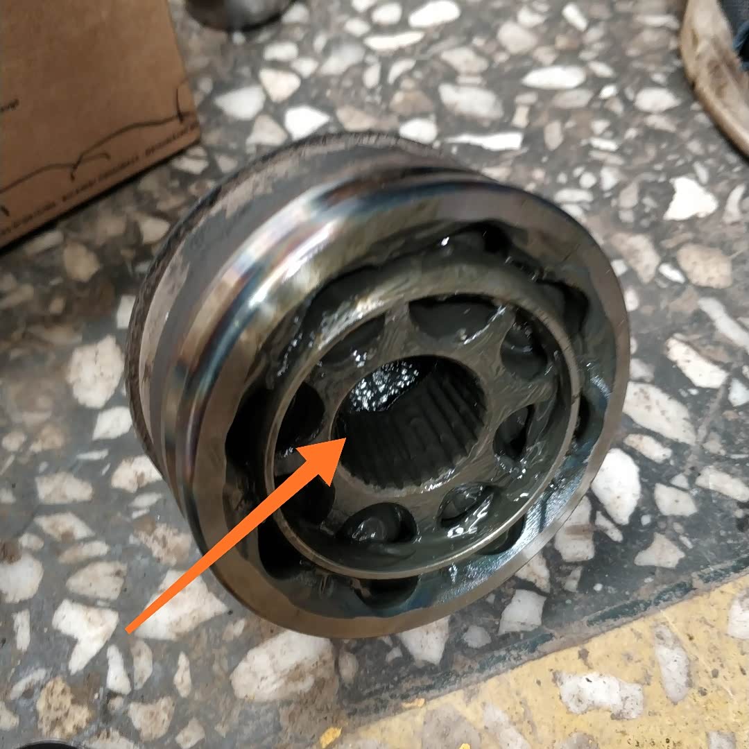 下图所示,这是师傅拆下来的外球笼,它的内部没有问题。如果这个外球笼出现问题,维修就需要更换整根半轴,维修成本比较大!现在只是外球笼防尘罩损坏,只需要把外球笼防尘套更换就可以了!