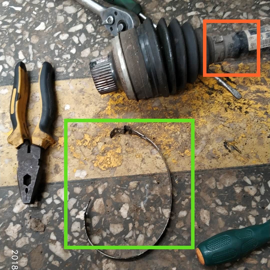 下图绿色区域所示,这个是固定外球笼防尘套的卡子,师傅花费了很多时间才把这个卡子给拆下来;下图橙色区域所示,这个是固定球笼套的小卡子,拆卸稍微容易一点!接下来,师傅需要把外球笼给拆下来!