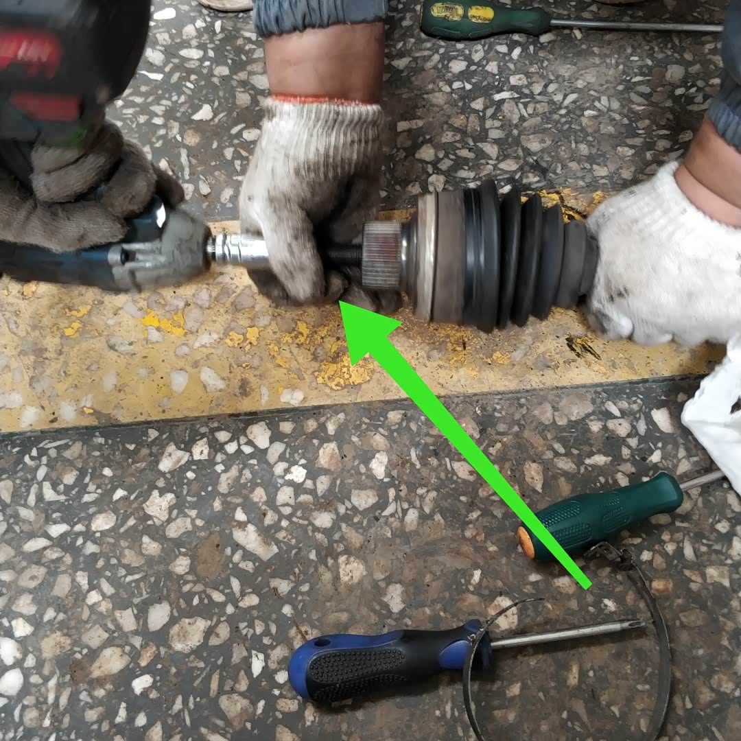下图绿色箭头所示,师傅把固定半轴大螺帽的螺丝拧入外球笼里面,这是干什么呢?师傅说,把这个大螺丝拧入外球笼就可以把外球笼给顶出来!