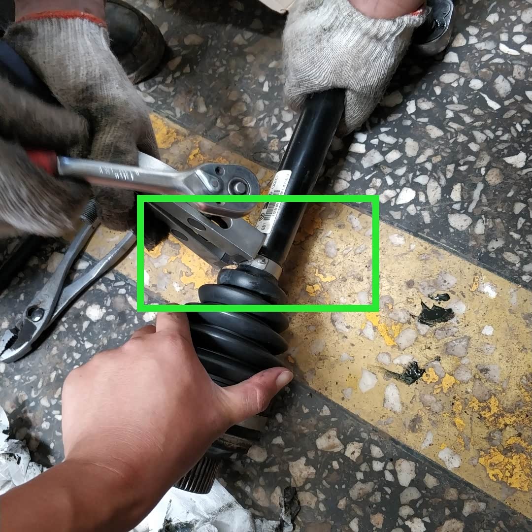 汽修师傅很快就把外球笼给安装到半轴上面,接下来师傅需要把固定外球笼套的两个卡子给固定好,在固定卡子前,师傅已经把球笼油挤进外球笼里面。下图绿色区域所示,师傅正在紧固外球笼套上面的这个小卡子!