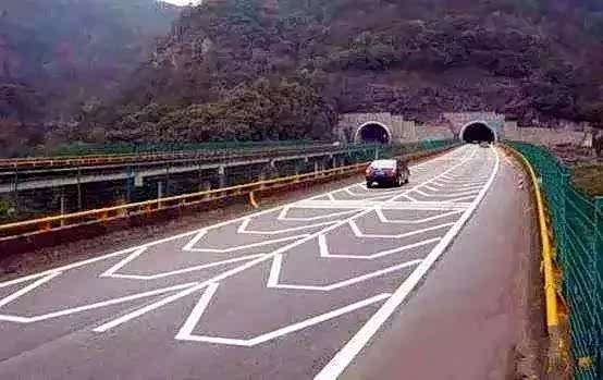错视觉标线是一种特种的减速标线,通常设置在急转弯、隧道外及隧道内一定区域,能让驾驶员产生空间压缩的感觉,沿行车方向看车道呈现由宽变窄及道路下凹的错视觉效果,促使驾驶员在进入急转弯或隧道前提前减速,起到一定的安全防范辅助作用。