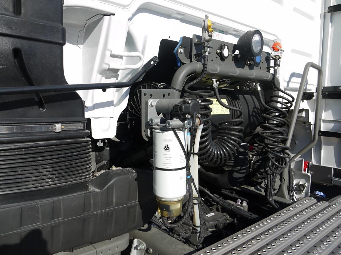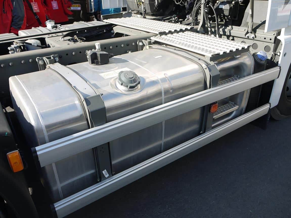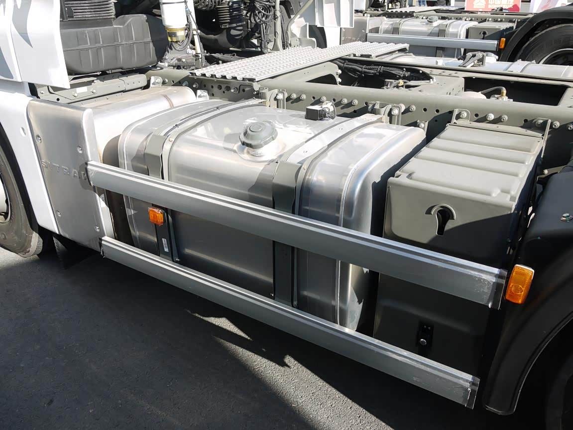 车辆左侧的油箱容积较小,不过也安装了防护条。油箱前面的是博世的SCR后处理系统,后面则是电瓶总成,而储气筒全部隐藏于车架的内侧。
