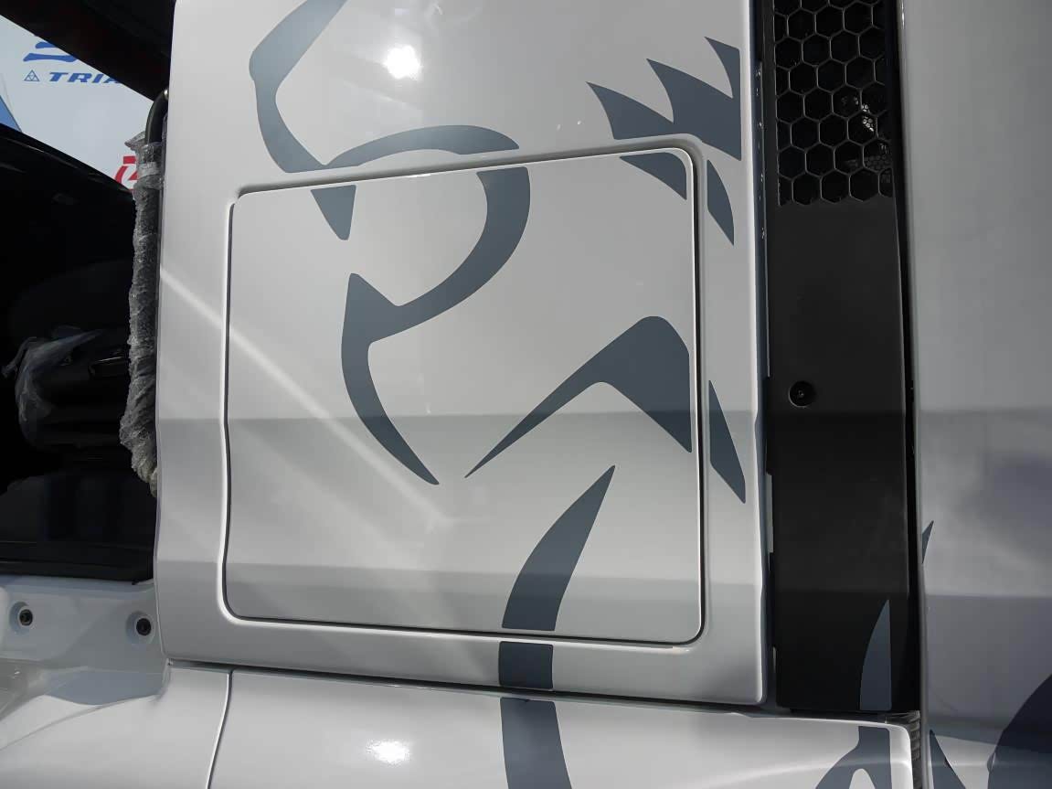 大家应该都知道,汕德卡C系列车型的驾驶室使用的是MAN技术驾驶室,所以说在外观造型上面还是非常协调的。这辆汕德卡C7H采用的是目前尺寸最大的CH7-G高顶驾驶室,驾驶室后面还有狮子彩绘,造型相当凶悍。