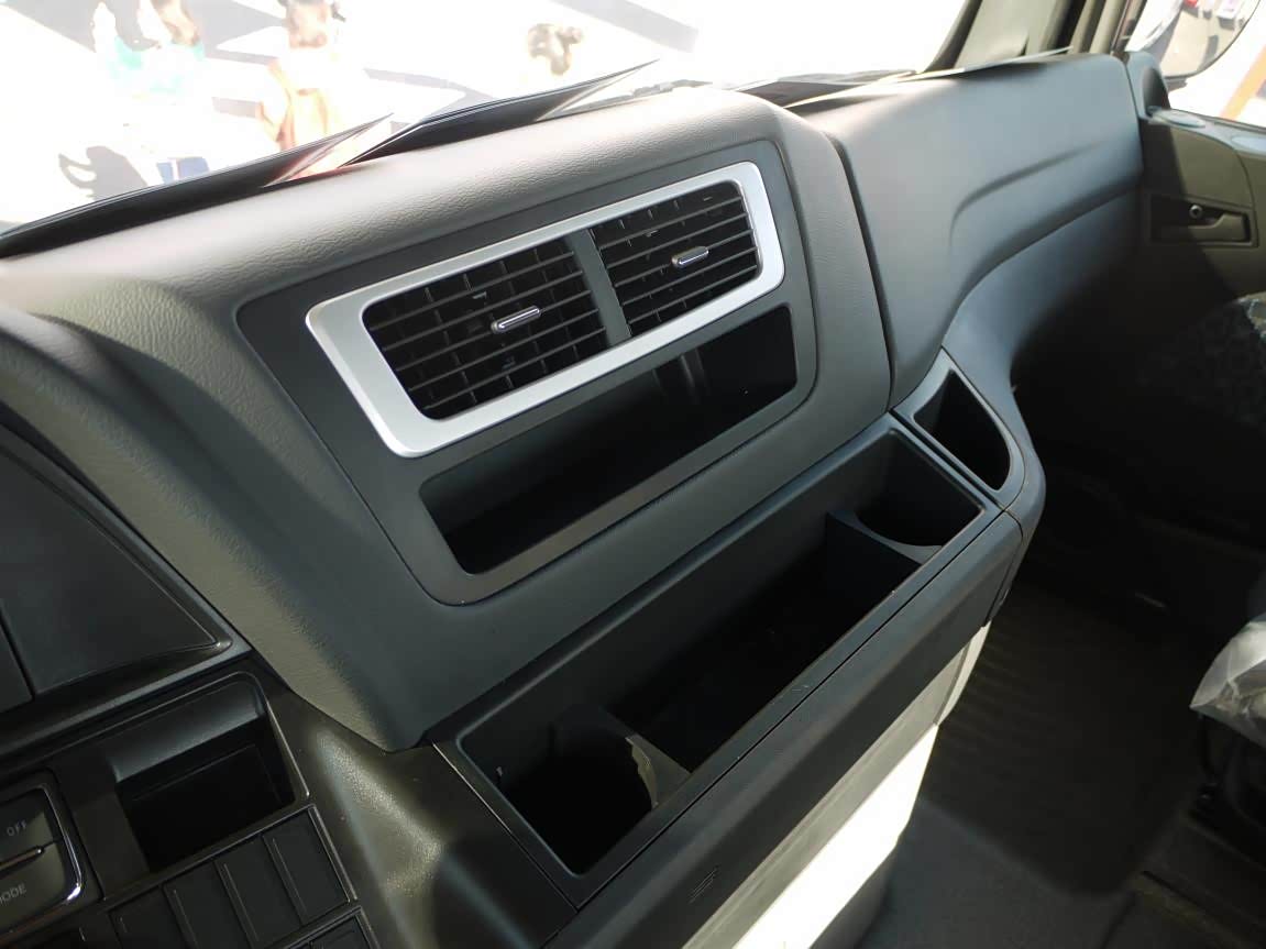 驾驶室前部工作台的中部,包括一对空调出风口,两个置物槽和一对水杯架,设计的合理且简洁。