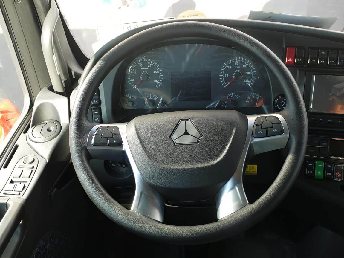 进入汕德卡驾驶室可以非常直观的感觉出来,里面的各项设计相当科学。四幅式方向盘凹凸有致,左右两侧的银色部分上面还安装了多功能按键,中间黑色面板则用很好的衬托出重汽的LOGO。后面的仪表盘采用6表+LED液晶显示器的布置形式,看上去相当直观。