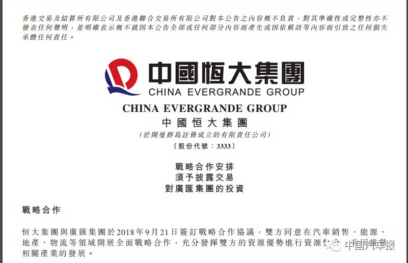 因港股中秋假期未休市,此前中国恒大、广汇汽车旗下的广汇宝信在9月23日晚间已对相关内容进行了公告。恒大集团和广汇集团共同表示,将充分发挥双方的资源优势进行资源整合,共同推动相关产业的发展。