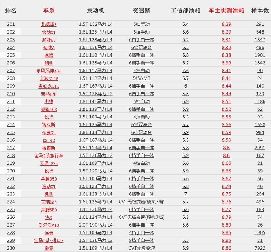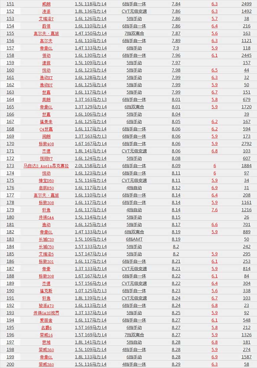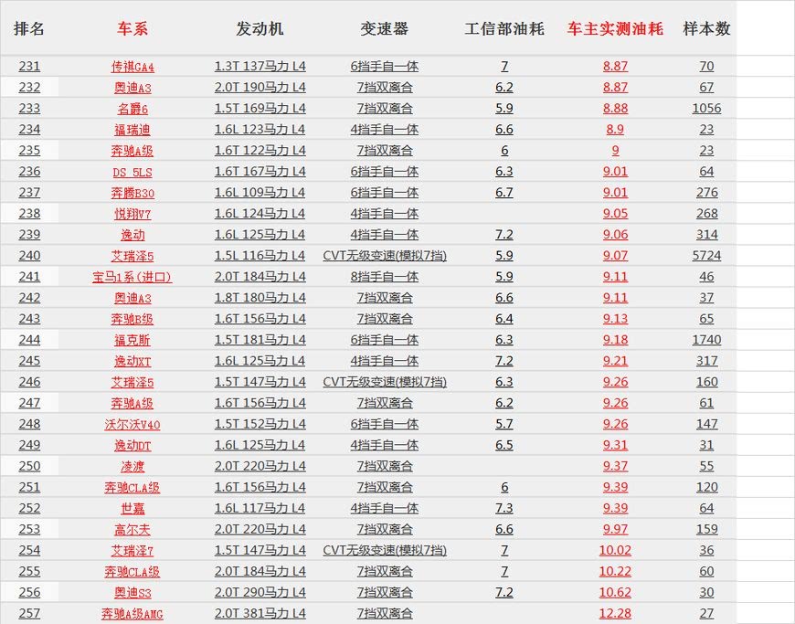 导读:A级车油耗排行榜出炉,1-257名完整版,看看你的爱车排名第几?