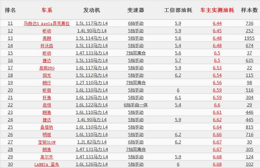 这个区间的车型大多还是合资车,在油耗方面我们国产车确实做得不如人家。排名11的是马自达3-昂克赛拉,车主实测油耗为6.44L,排名14的是雪佛兰-科沃兹,虽然也是油耗较低,但是与工信部油耗确实相差很大,所以科沃兹在我们国内的口碑并不是很好。大众捷达排名第16位,在我们国内被称为国民神车的捷达,在油耗方面也确实做得不错,1.5L的排量平均油耗仅为6.5L。